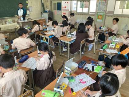 理科「電気のはたらき」では実験キットを使います。説明書をよく読んで準備に取り掛かります。