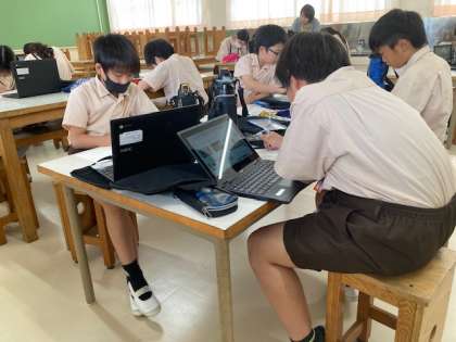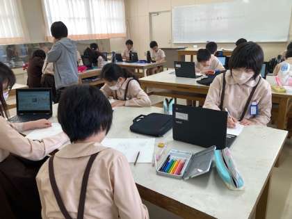 漫画・絵画クラブは「最高の作品袋」を制作しています。タブレットでデザインを参考にしながら、作っていきます。