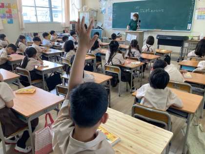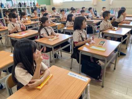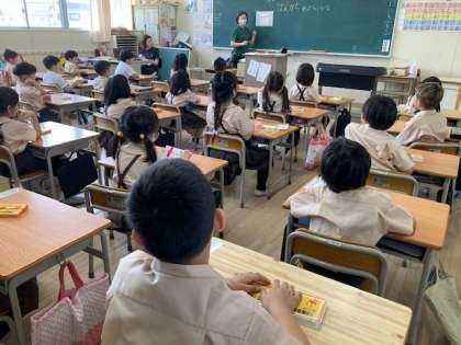 図工「こんな はんかち あったらいいな」ではパスの新しい使い方を教わりました。色や形を工夫しながら作っていきます。
