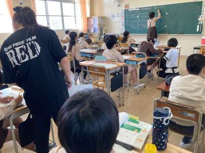 算数「分数でわる計算を考えよう」では数直線を使って考えています。