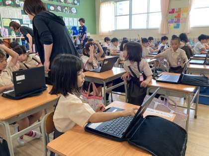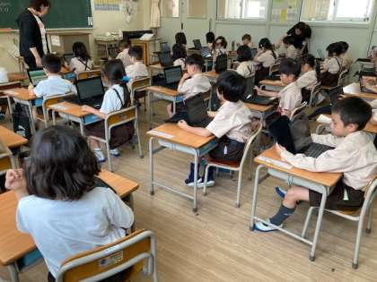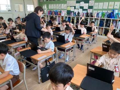 タブレットを使って学習しました。お話を良く聞いて上手に扱っています。