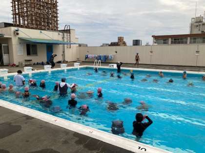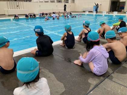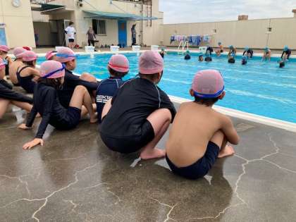バディを組んで安全第一に水遊びをします。気温が上がって気持ち良く学習することができました。2年生の真似をして1年生も楽しく活動できました。