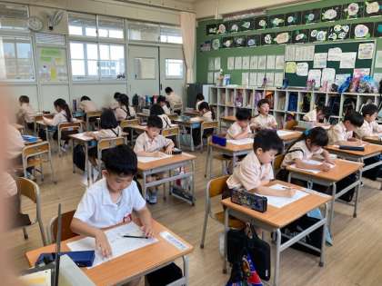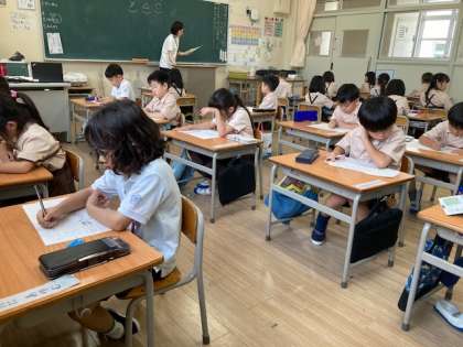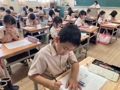 7月に入り、残り3週間となりました。1年生もテストに取り組んでいます。名前を書いて問題をよく読んで確かめながら考えます。