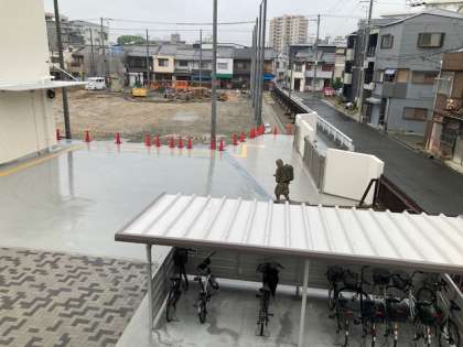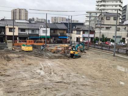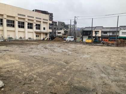 今日から正門が戻りました。雨が降る中、混乱なく登校できました。造成工事は着々と進んでいます。