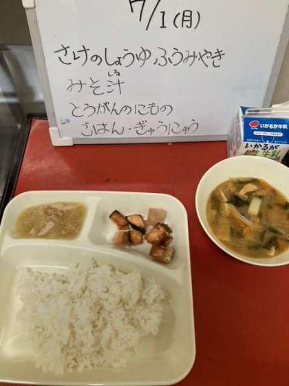 給食の準備を当番が協力して行っています。配膳係は手際良く配り当番以外の児童は読書等、自席で静かに待ちます。