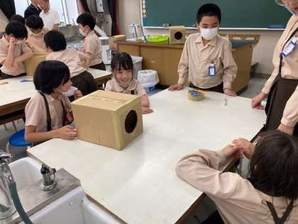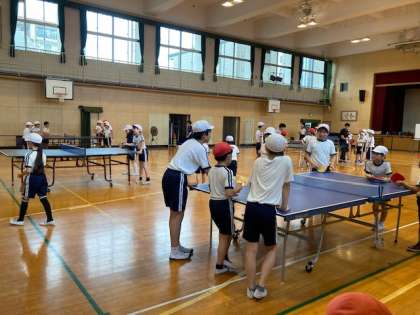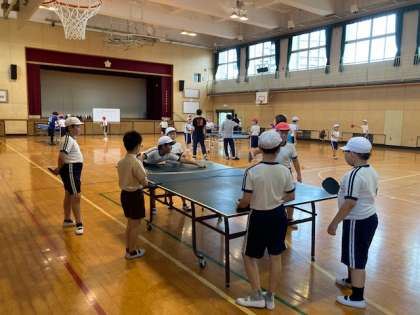 体育館では卓球大会を、理科室では「空気砲」づくりを楽しんでいます。