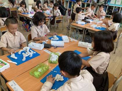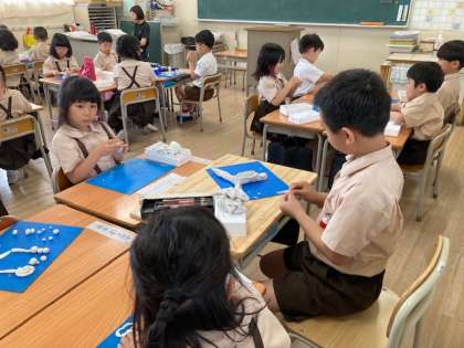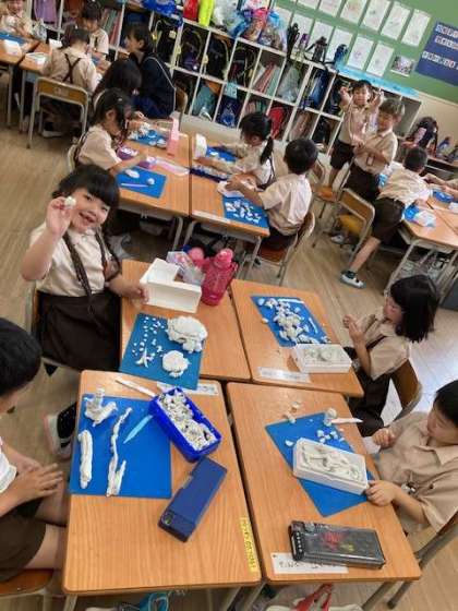 粘土を使って、作りたいものを表現しています。思い思いに作ったり班で共同制作をしたり、伸び伸びと学習しています。