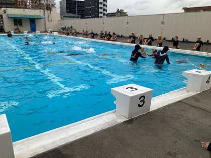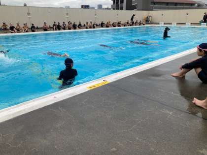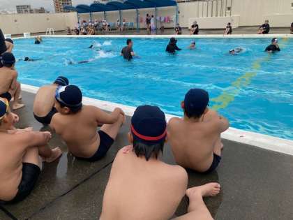 プール水泳は中学年が合同で学習しています。日の光はありませんが気温・水温は高くて気持ちが良かったです。