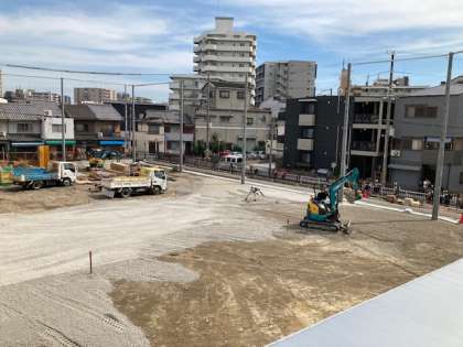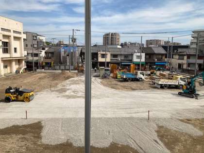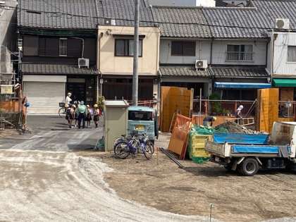 暑い中、運動場整地が進んでいます。砂利が敷かれ、均等にならしています。