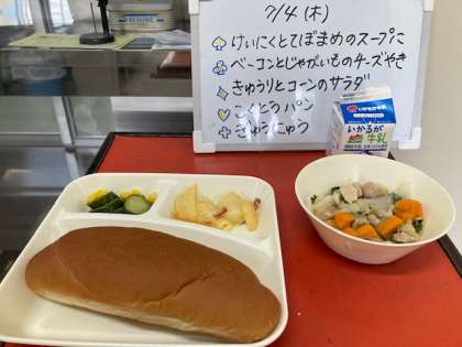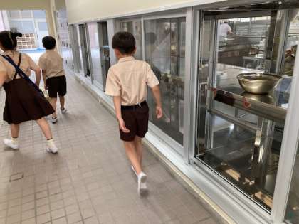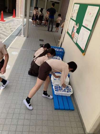 美味しい給食を残さず食べています。当番は協力して各学級の後片付けをします。給食委員は牛乳パックの後始末をしてくれます。
