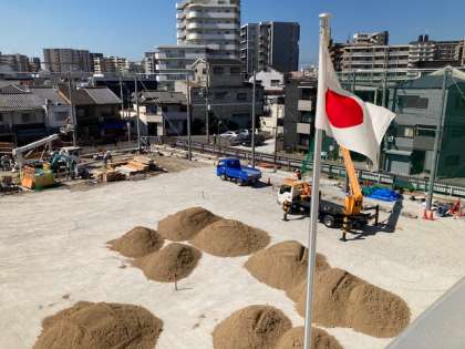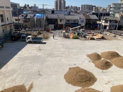 砂利層が広がって真砂土の準備に取り掛かっています。防球ネットの設置も進んでいます。