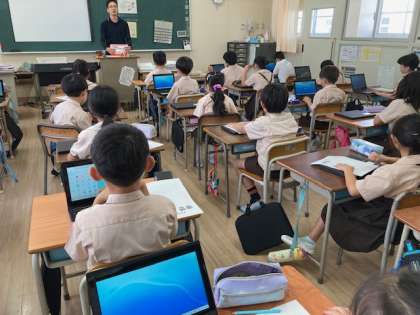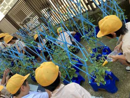 生活科はミニトマトの観察をします。タブレットに写真を保存してじっくりと観察することができます。後で「みつけたよカード」に記録をします。