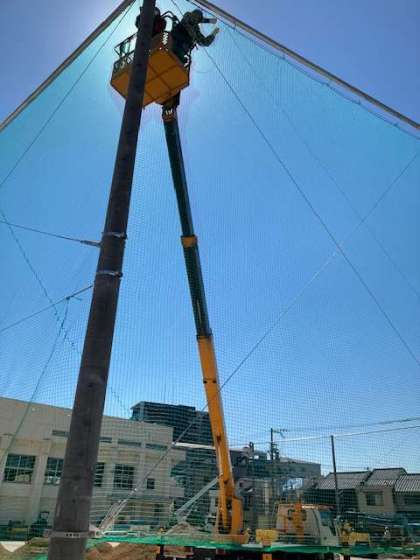 暑い中の高所作業は大変ですが、ネット設置は着実に進んでいます。