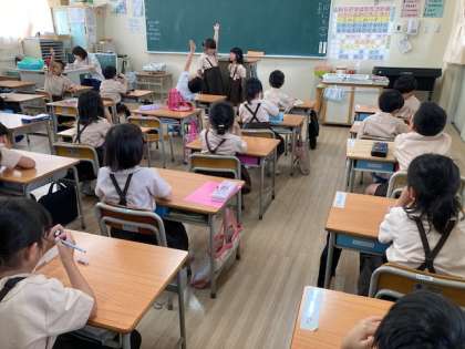 朝の会では、日直のスピーチを聞いて質問をします。コミュニケーションのとり方を学んでいます。