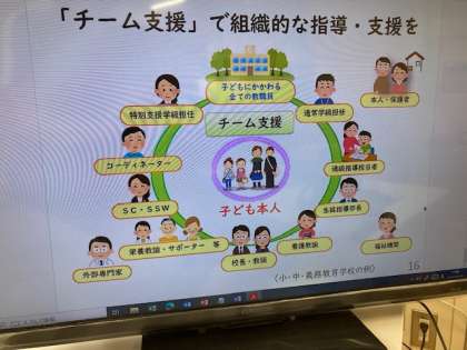 研修を受けた内容等を教員同士で伝達講習をしたり情報共有したりして指導力の向上や児童理解の深化を図ります。