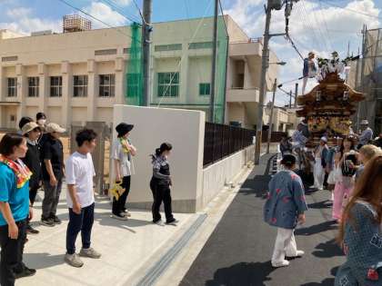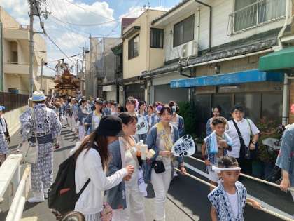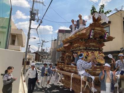 気温が上がる中、力強く曳航しています。地域の方に見守っていただき、熱中症予防に留意しながら地域の祭りが進められています。