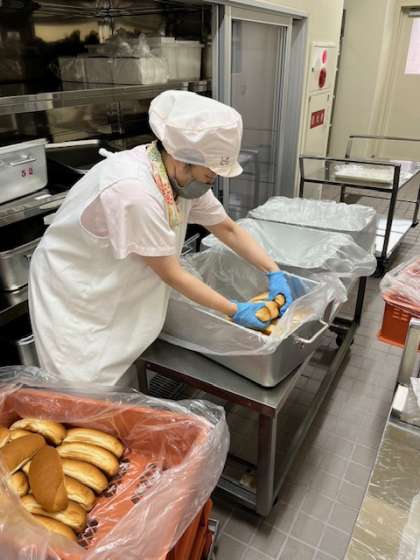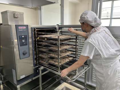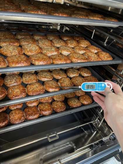また、ハンバーグを焼物機で焼き、中心温度を測って中までしっかり加熱できてるか確かめています。