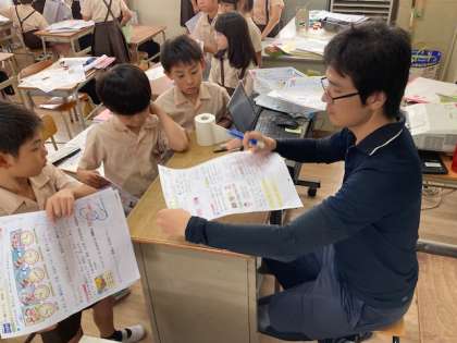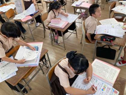 プリントの間違い直しをして、理解を深めています。終わったプリントをきちんと整理する大切さも学んでいます。