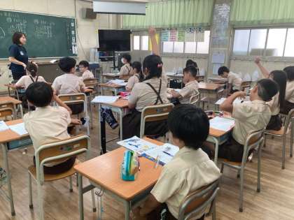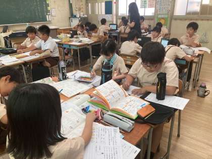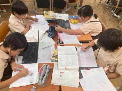 国語「ことわざ・古事成語」ではタブレットや辞書で調べています。色々な情報から自分の必要な内容を取捨選択していきます。