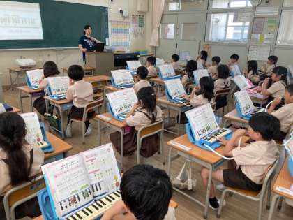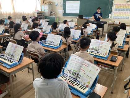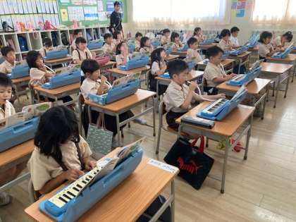 音楽「どんぐりさんの おうち」では鍵盤ハーモニカで、ドとソの音を弾きました。よく聞いて音の違いが分かりました。