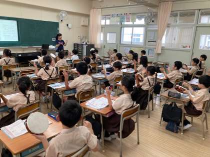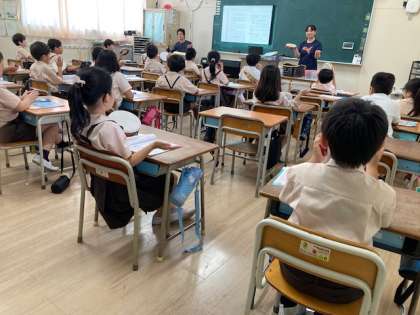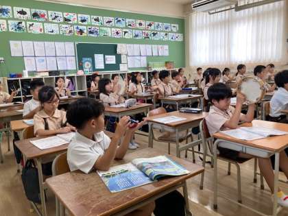 音楽「はくに のってリズムを うちましょう」ではカスタネットとタンバリンを使って2拍子のリズム打ちをしました。音が揃うと気持ち良いです。