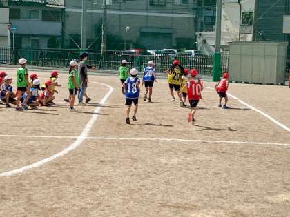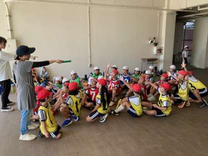 熱中症対策のため、ピロティを活用しながらバトンパスの学習をしています。イメージを持ってリレーの練習に取り組んでいます。
