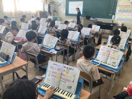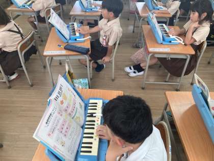 音楽「ドレミファソのおとと なかよしになりましょう」では、元気良く歌った後に鍵盤ハーモニカを使って指ならしをしました。