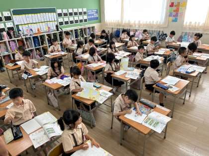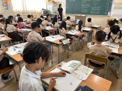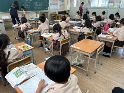 算数「3つの かずの けいさん」では、足し算と引き算の混ざった計算もできるようになってきました。