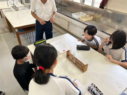 理科「水溶液と金属」では、薬品を使って実験をしました。安全に気を付けながら変化の様子を確かめています。