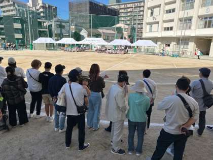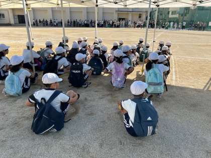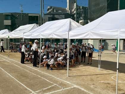 いよいよスポーツフェスティバルが始まります。児童は「万博のテーマソング」を聞きながら、教室からテントへ移動しています。