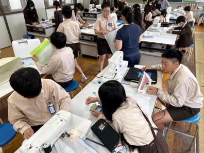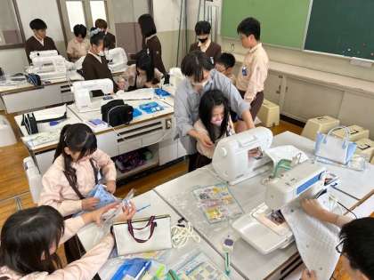 家庭科「ナップザックを完成させよう」では、ミシンやアイロンで仕上げにかかっています。