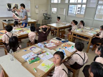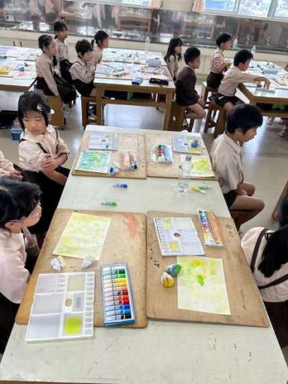 図工「紙はんが」の作品確かめポンポンを使って色をのせていきます。