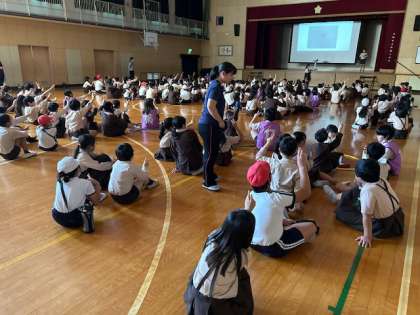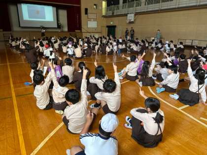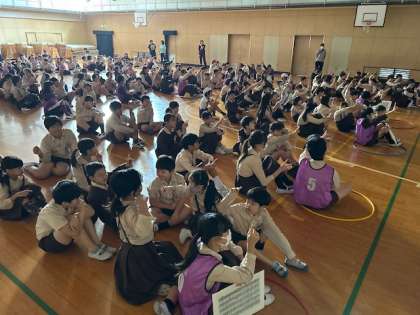 児童集会は集会委員が作った問題をたてわり班で相談して答えます。