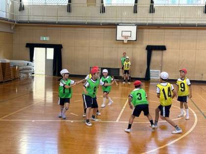 体育「ポートボール」では、パスをしないルールでゲームをします。ドリブルがないので、走ったり声を掛けたりして、考えながら取り組んでいます。