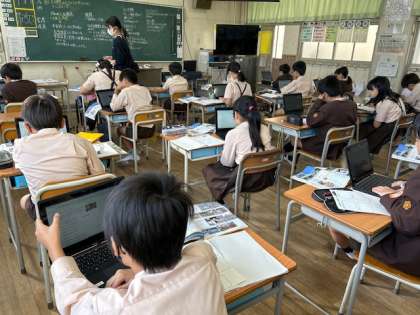 社会「天神祭のようす」では、タブレットを使って詳しく調べています。自分の欲しい情報を適切に調べる事ができるよう学んでいます。