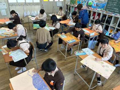 図工「アボリジナルアート」は、根気よく色を載せていきます。