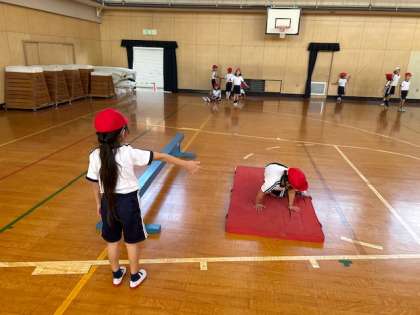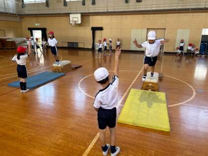 体育「跳び箱遊び」は、ぴょんぴょんウサギ・クマの背中渡り等、楽しく運動しています。