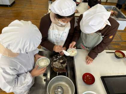家庭科「ご飯と味噌汁」は、調理計画をもとに役割分担をして協力して作りました。ガスレンジで炊いたお米には、おこげがついています。出汁からとった味噌汁は美味しかったです。