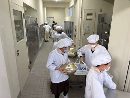 教室に戻った給食当番は協力して配膳をしています。