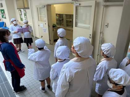 給食委員会の児童が各学級の給食当番に献立や衛生面の確認をしています。調理員さんが配缶のお手伝いをしていただいています。
