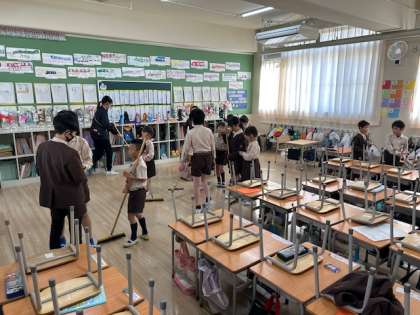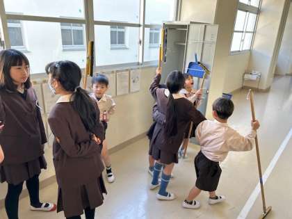 掃除の時間は、1年生が安全に綺麗に掃除ができるように6年生がお手伝いをしながら、掃除の仕方を伝えています。