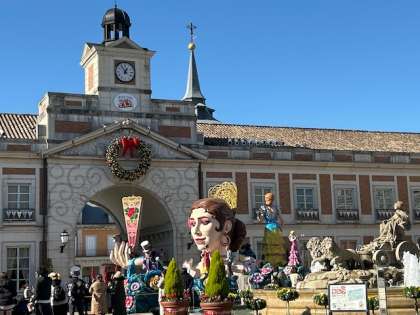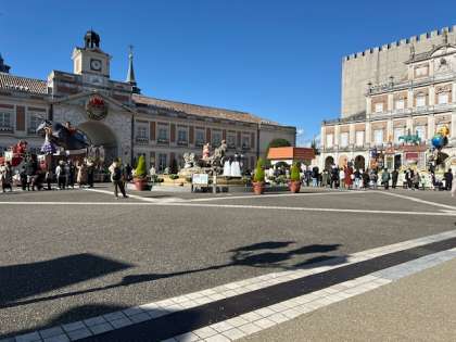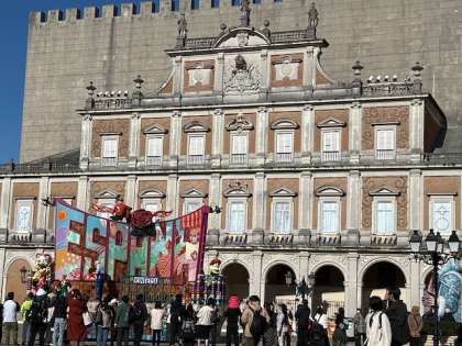 少し風がありますが柔らかい日差しのもと、友達と素敵な時間を過ごしています。パレードやクリスマスの飾りが雰囲気を盛り上げています。