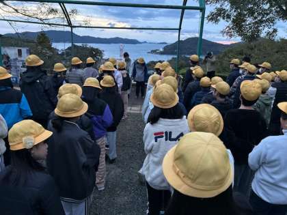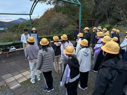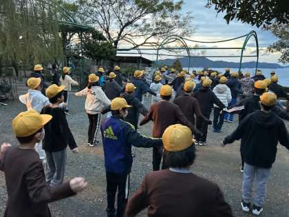 朝の集いは、屋外の「めだかの学校」で行います。気温は低いですが良いお天気になりそうです。