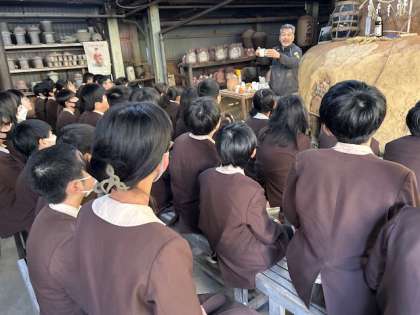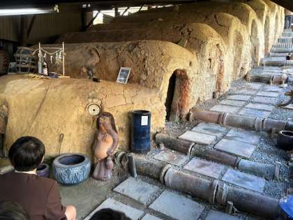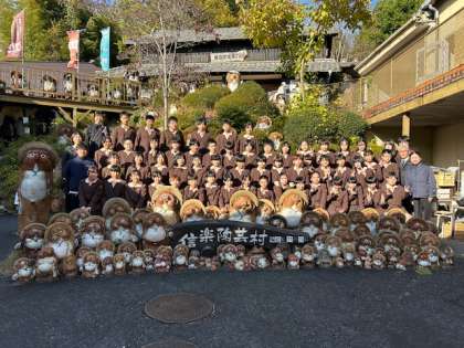 信楽焼陶芸村に着きました。狸と一緒に学年写真を撮ります。