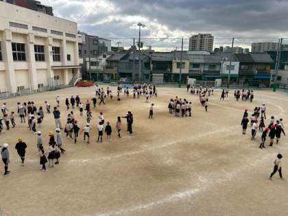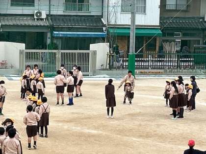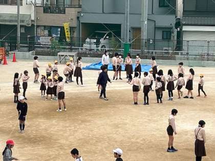 たてわり班で長縄を楽しんでいます。汗ばむ程の運動です。