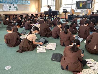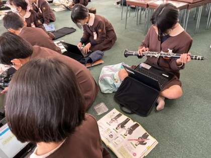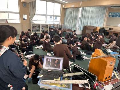 音楽「茶色の小びん」は木管楽器の音色や特徴について学習しています。実際に楽器に触れることで鑑賞に繋がる関心が高まりました。