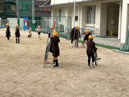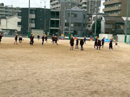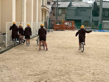 運動場をいっぱいに使ってドッヂボールをしたり安全に気をつけながら一輪車や竹馬を楽しんでいます。