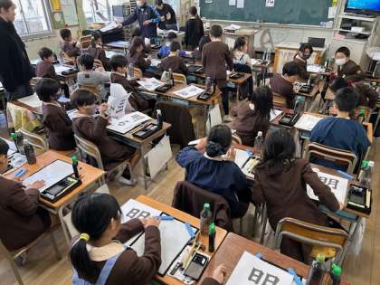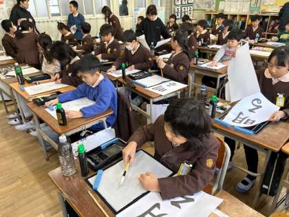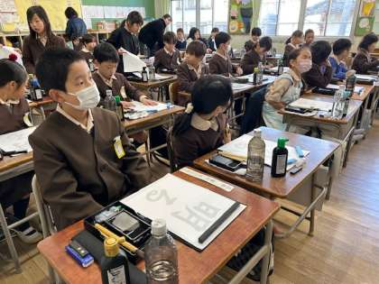 書き初め「明るい心」は、初めて長半紙に書きます。お手本をよく見て心を込めて書きます。