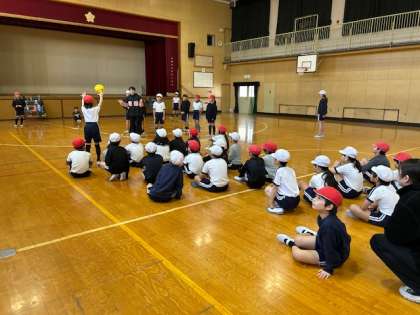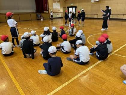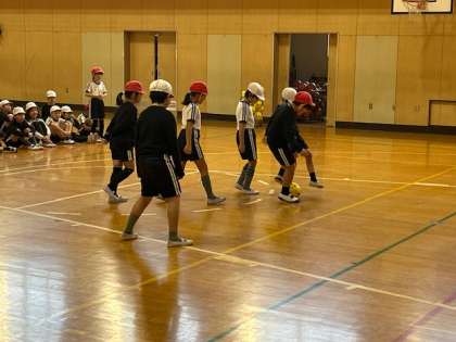 体育「ラインサッカー」は、ルールを確認しながら、パスを意識するために体育館で活動しました。
