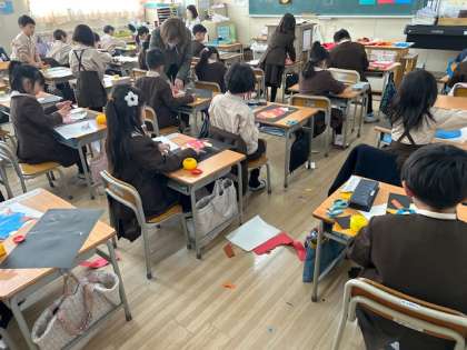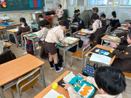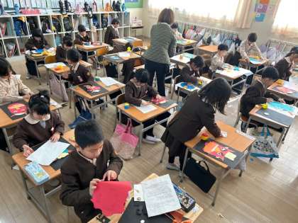 図工「おにのおめん」は色画用紙を指でちぎって節分のお面を作りました。指先の器用さが高まってきています。